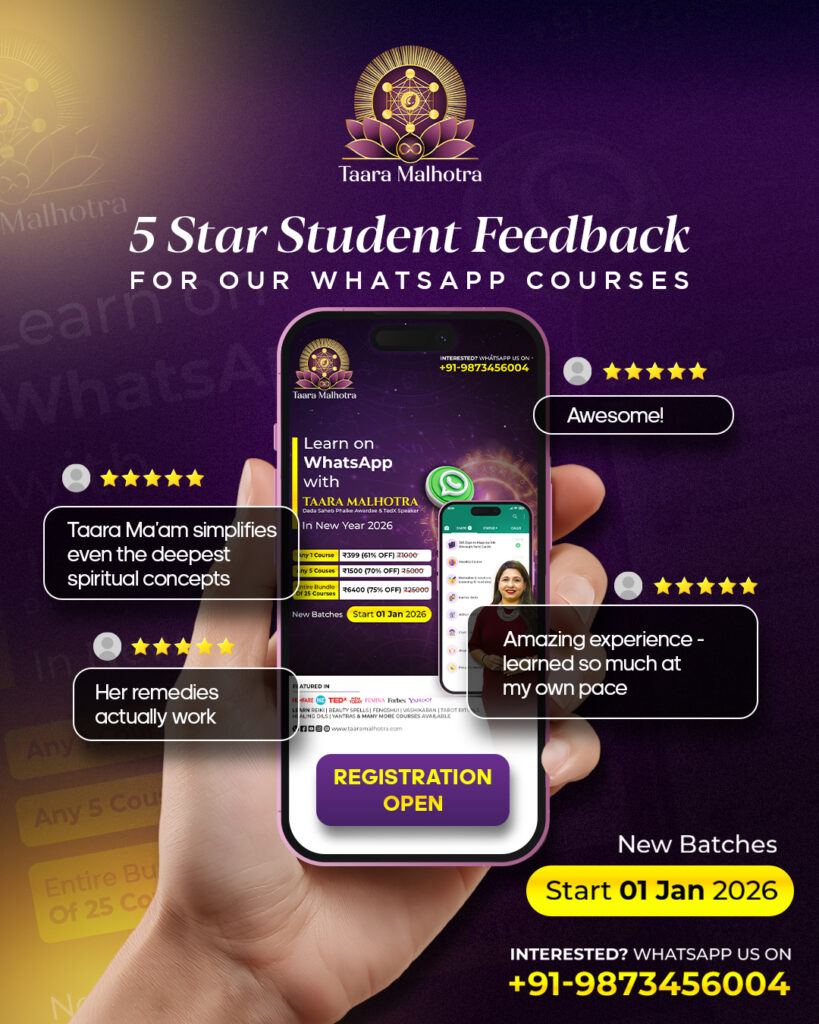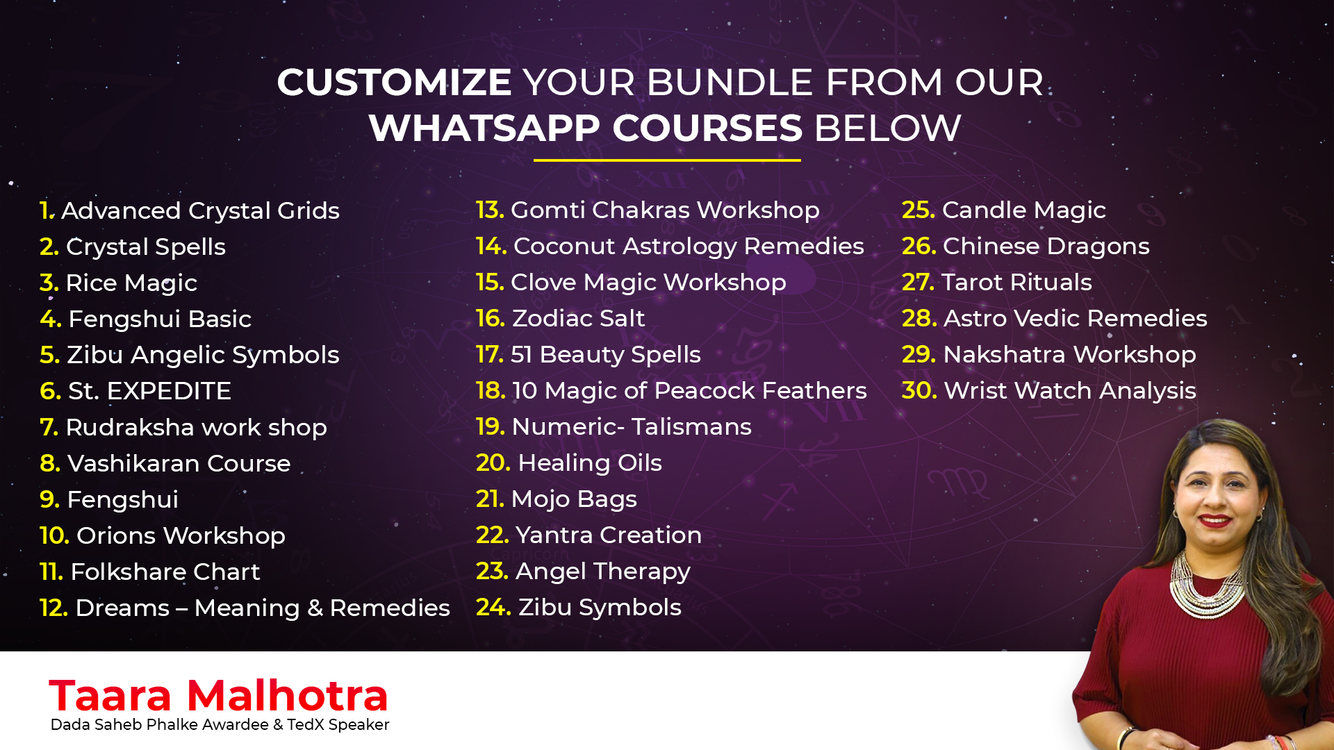 - Aditi Sinha, JaipurThe WhatsApp Courses are a set of bite-sized, practice-focused lessons offered by Dr. Taara Malhotra — designed to deliver spiritual, intuitive and healing training via WhatsApp. Materials are provided through video, audio and PDF formats so you can learn from anywhere and at any time.